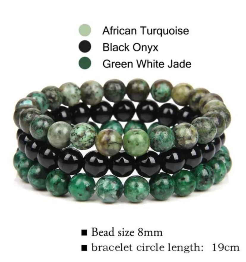 Découvrez ce bracelet élégant en pierres naturelles, comprenant le turquoise d'Afrique, l'onyx noir et le jade vert. Parfait pour ajouter une touche unique à votre tenue. Avec un diamètre de perles de 8 mm et une longueur de 19 cm, il s'adapte confortablement à votre poignet. Idéal pour toutes les occasions, il devient un accessoire incontournable pour ceux qui recherchent l'harmonie et l'équilibre dans leur style.