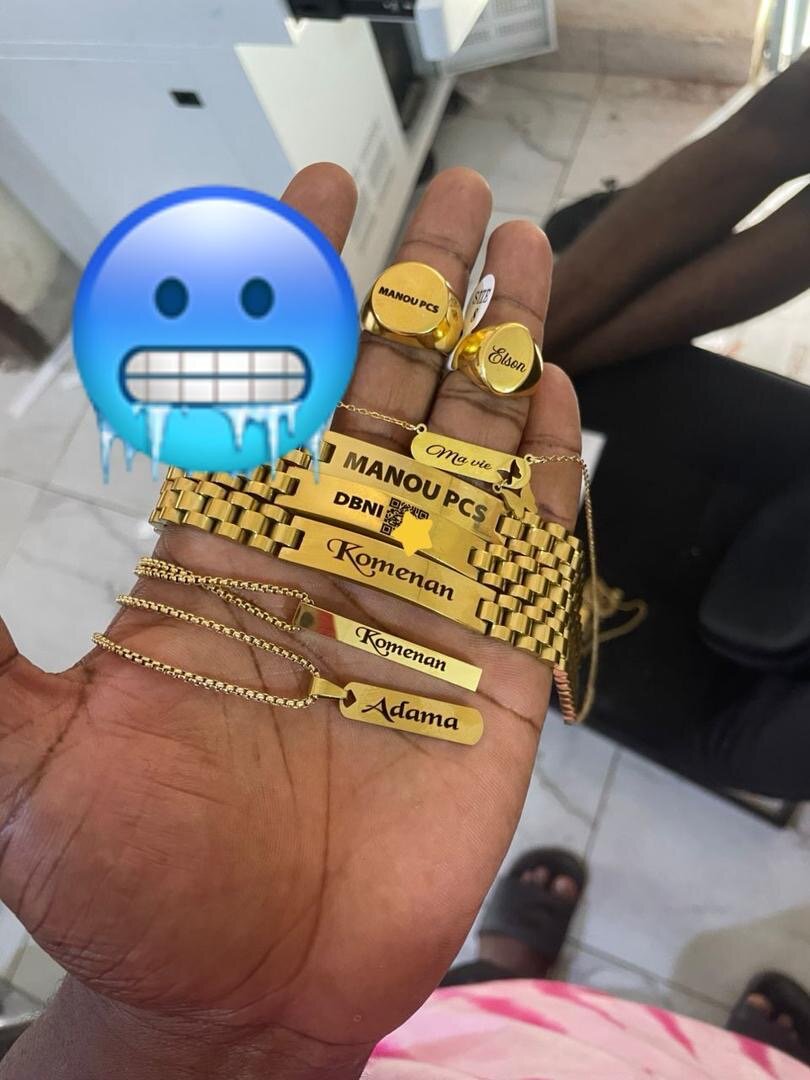 Bracelets en plaqué or personnalisés avec noms ou messages. Conçus en différents styles et matériaux de qualité. Idéal pour un cadeau unique ou un accessoire personnel.