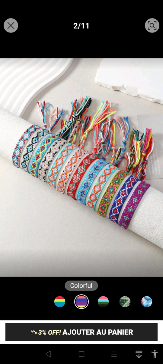 Découvrez nos magnifiques bracelets tissés à la main, parfaits pour ajouter une touche bohème à votre tenue. Disponibles en plusieurs motifs vibrants, ces bracelets sont idéals pour exprimer votre style unique. Fabriqués avec soin, ils sont durables et confortables à porter tous les jours. Un cadeau parfait pour vous-même ou vos proches!