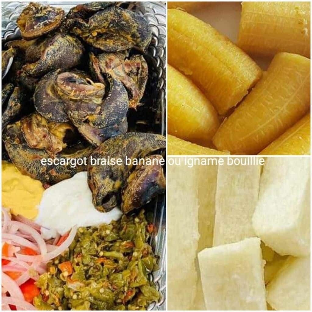 Découvrez notre délice d'escargot braisé accompagné de banane plantain et d'igname bouillie. Une expérience culinaire authentique, parfaite pour les gourmets.