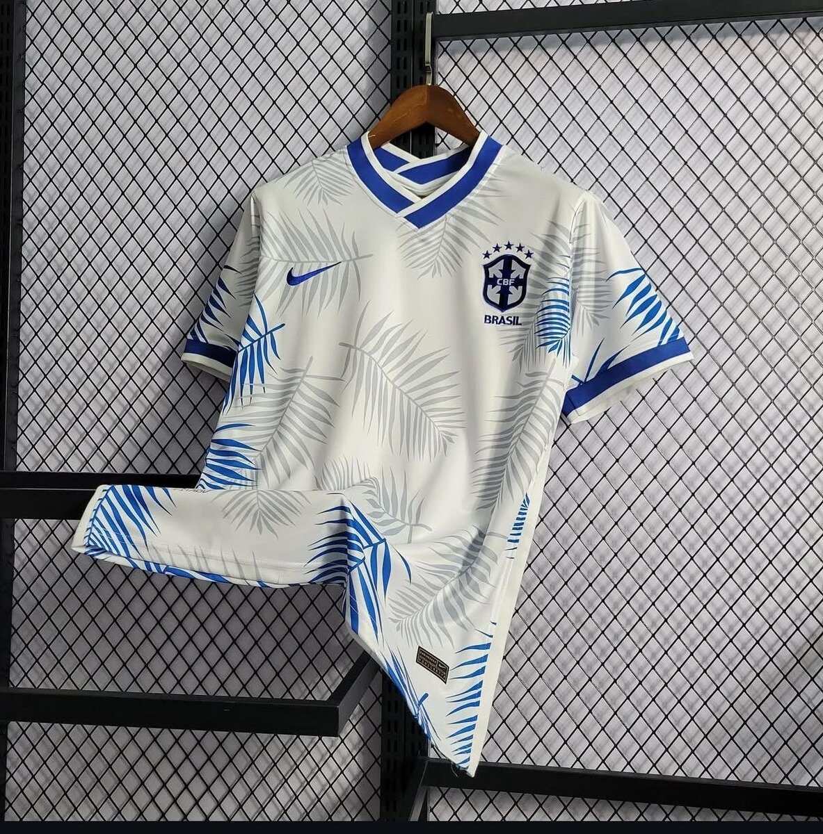 Stylish Brazil soccer jersey with vibrant blue palm leaf design. Perfect for fans and players alike, offering comfort and style. Features the team crest for an authentic look. Ideal for sports events or casual wear.