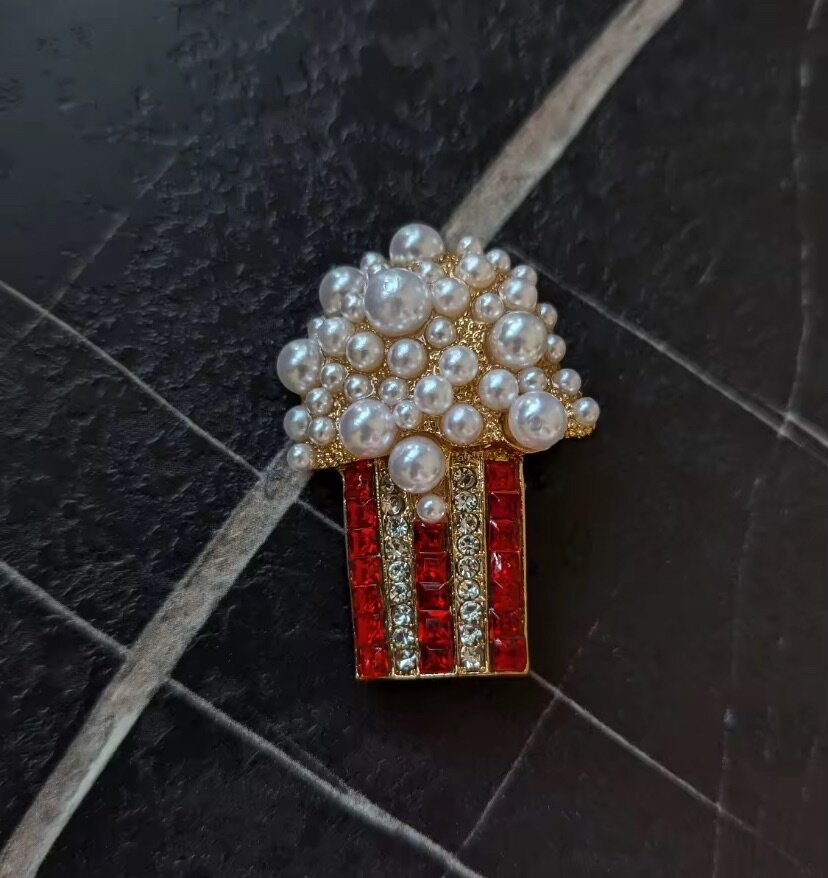Ajoutez une touche ludique à votre tenue avec notre broche popcorn ornée de perles et strass scintillants. Idéale pour les amateurs de mode audacieuse, elle fait un excellent choix de cadeau.