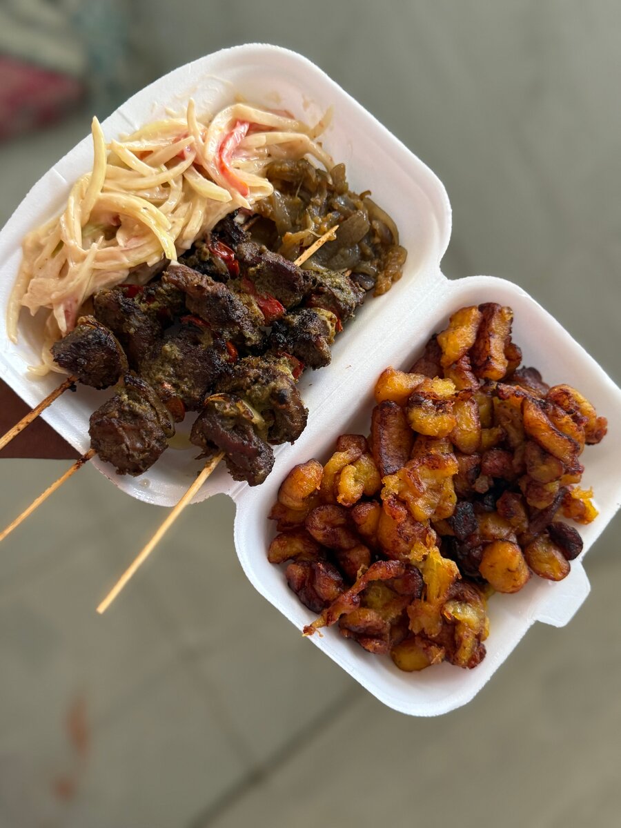 Dégustez nos brochettes juteuses accompagnées de frites croustillantes et de plantains frits. Parfait pour un repas rapide et délicieux !