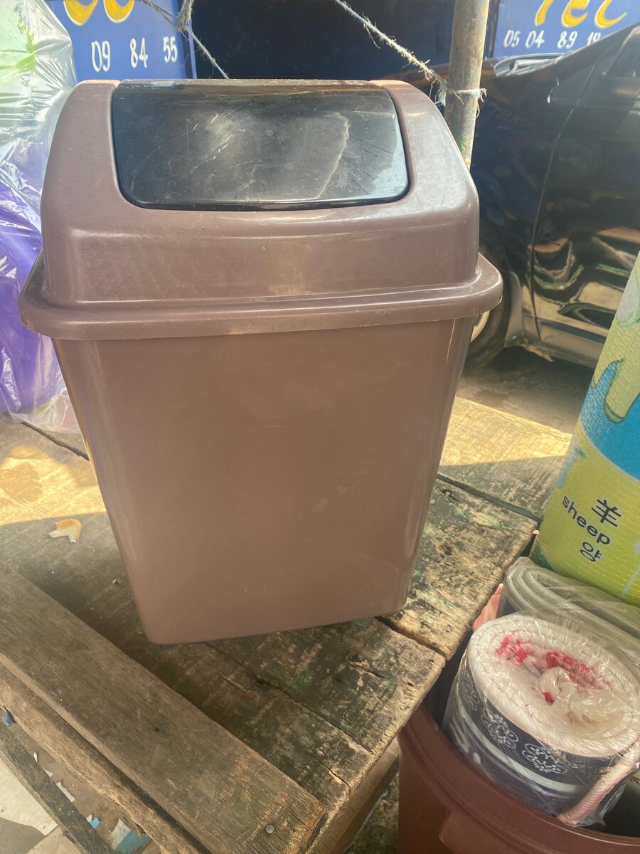 Durable brown plastic kitchen trash bin with a swing lid. Ideal for home or office use, keeping spaces tidy and organized. Easy to clean and maintain, perfect for everyday waste management.
