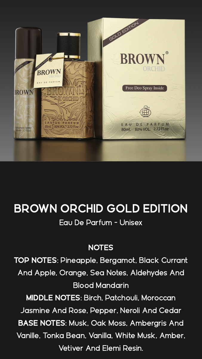 Découvrez Brown Orchid Gold Edition, une eau de parfum unisexe qui allie des notes vibrantes d'ananas, bergamote et cassis en tête. Son cœur révèle un bouquet de jasmin marocain et de rose, enveloppé de notes boisées de patchouli. Idéal pour ceux qui cherchent un parfum équilibré et luxueux, parfait pour toutes les occasions.