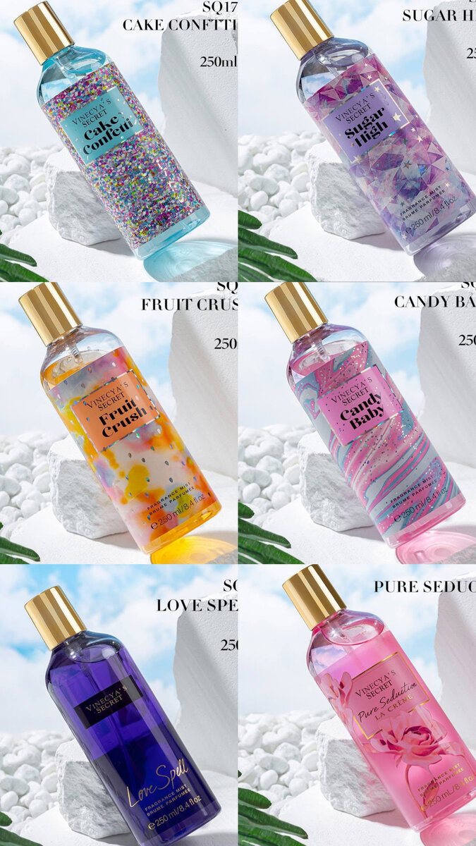 Découvrez notre collection de brumes parfumées de 250ml, incluant des fragrances telles que Cake Confetti, Candy Baby et Pure Seduction. Parfait pour une touche fraîche au quotidien.