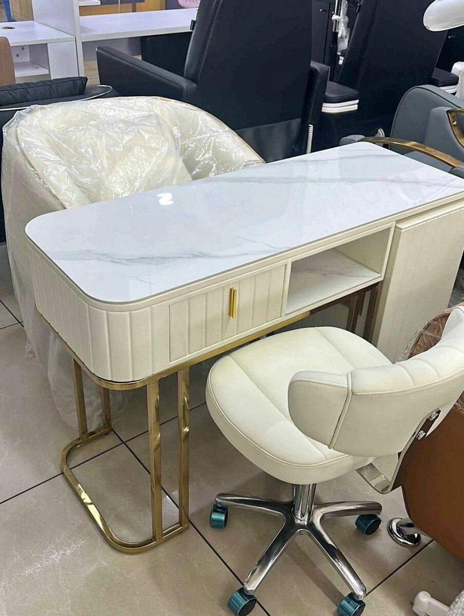 Élégant bureau de manucure avec plateau en marbre, rangement intégré et chaise confortable. Parfait pour un salon professionnel ou un usage personnel, offrant un design à la fois pratique et esthétique.