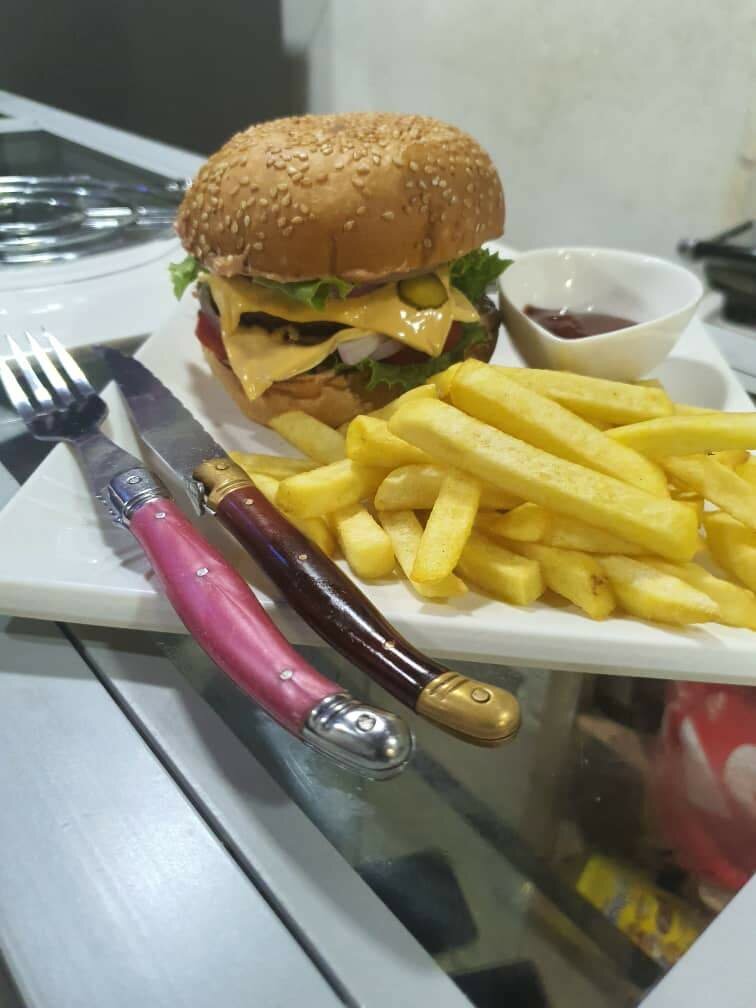 Découvrez notre burger gourmet avec des frites croustillantes, idéal pour un repas délicieux à la maison. Préparé avec des ingrédients frais et savoureux, il ravira vos papilles. Accompagné d'une sauce succulente.