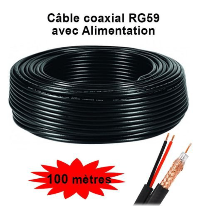 Câble coaxial RG59 de haute qualité, idéal pour les installations de vidéosurveillance et de télévision. Longueur : 100 mètres. Câble coaxial robuste pour une transmission vidéo fiable.
