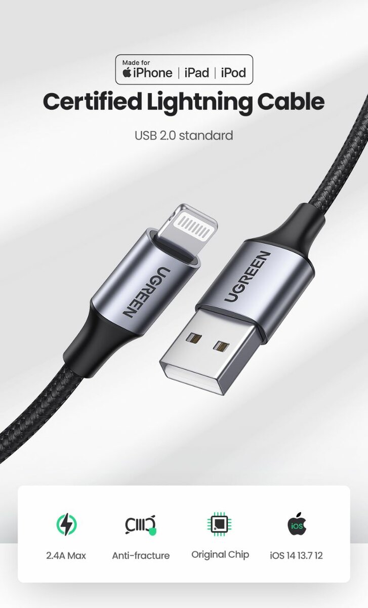 Câble USB vers Lightning UGREEN Certifié MFi, compatible avec iPhone et iPad. Charge rapide 2,4A, résistant aux ruptures. Idéal pour une charge rapide et sûre de vos appareils Apple.
