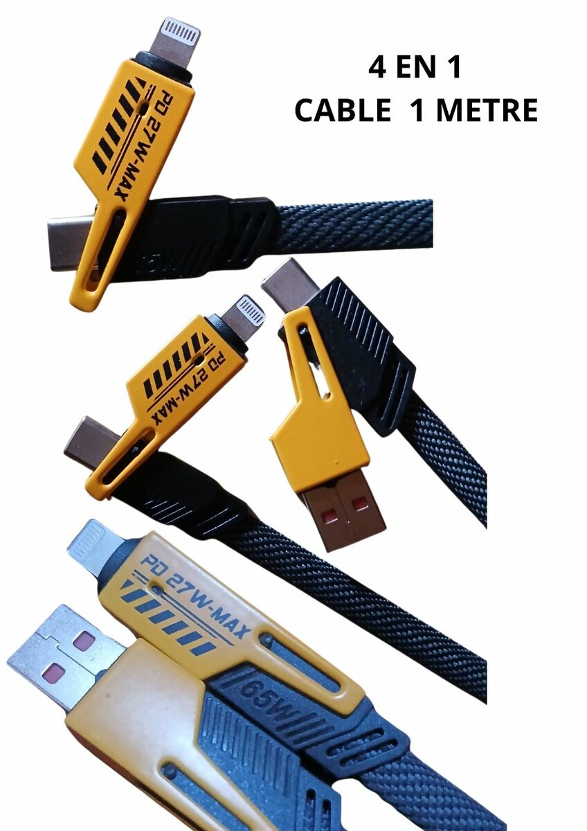Câble USB multifonction 4 en 1, compatible avec plusieurs appareils. Pratique et résistant, idéal pour charger vos appareils rapidement et facilement.