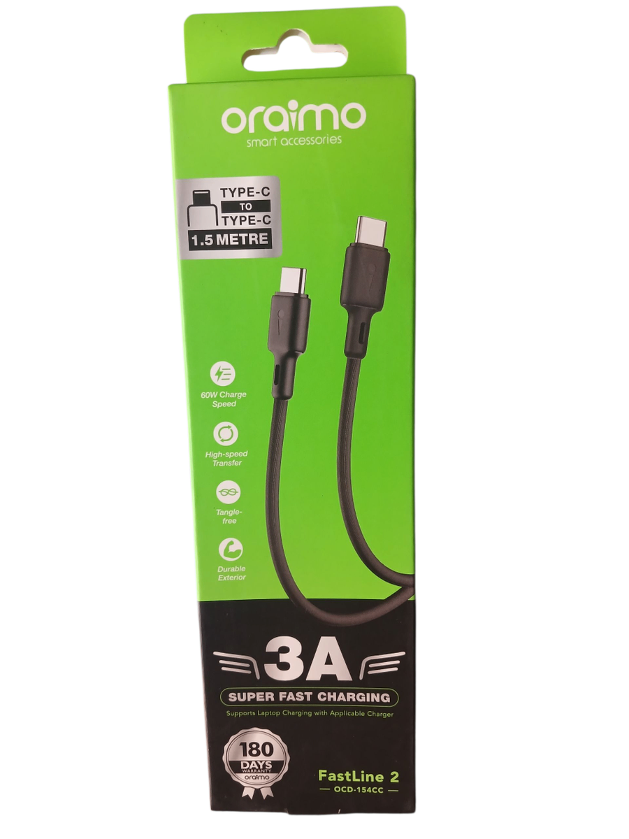 Optimisez votre charge avec le câble Oraimo USB-C de 1.5m. Profitez d'une charge rapide de 3A pour vos appareils, garantissant performance et efficacité. Idéal pour la maison ou le bureau.