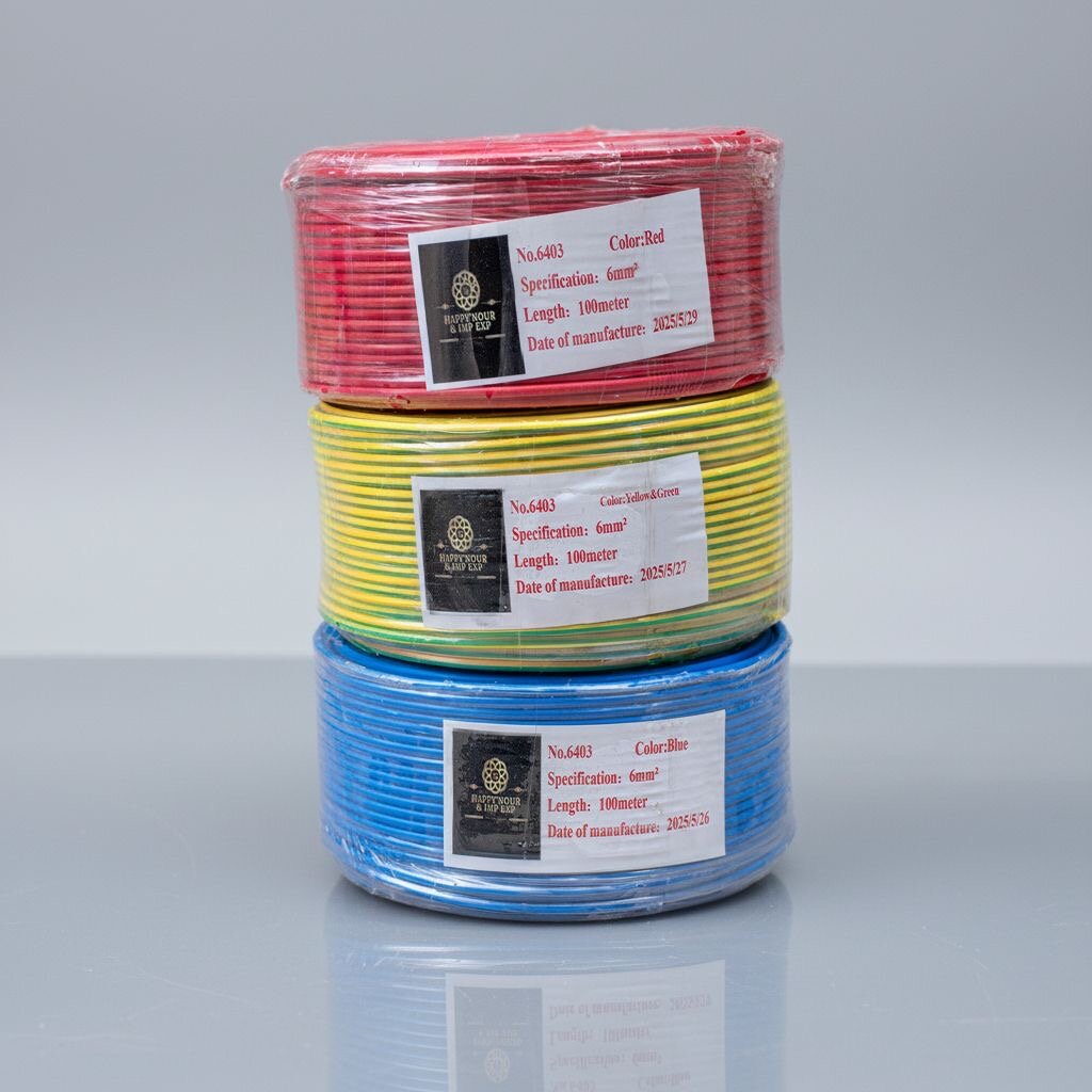 Câbles électriques de haute qualité de 100 mètres chacun en rouge, jaune et bleu. Parfaits pour des projets résidentiels et commerciaux, ces câbles de 6mm assurent une conductivité optimale et une sécurité maximale.