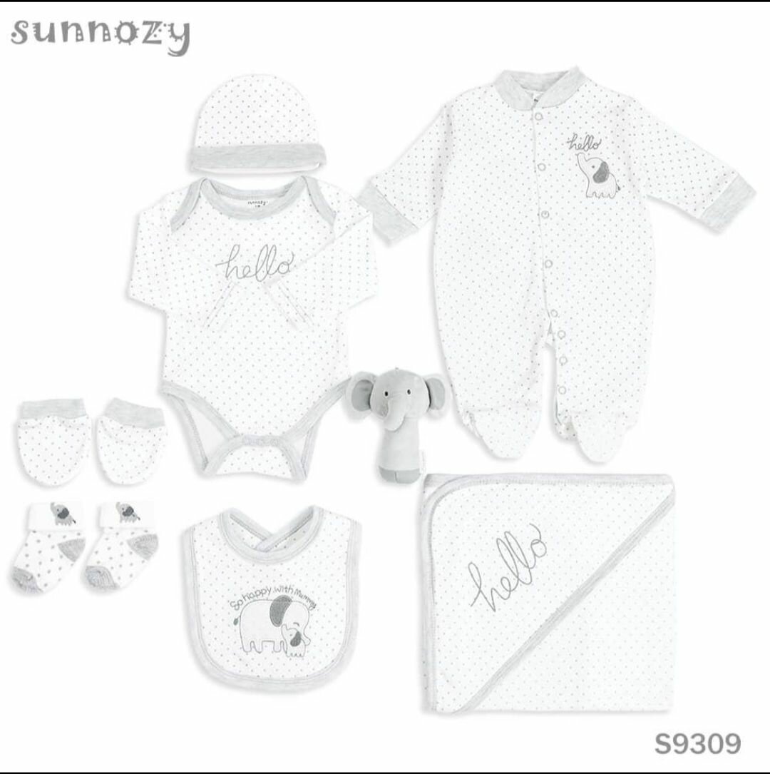Un ensemble complet de vêtements pour nouveau-nés. Doux et confortable, idéal pour les bébés garçons. Comprend : body, gilet, bavoir, chapeau, chaussettes, couverture.