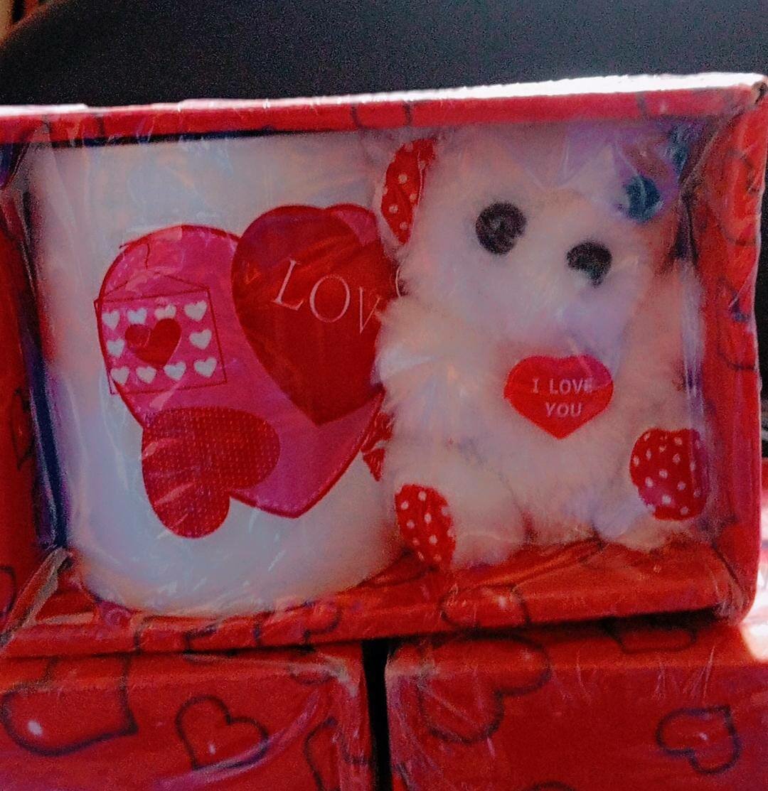 Découvrez ce coffret cadeau idéal pour la Saint-Valentin, comprenant une tasse blanche décorée d'un motif cœur et une adorable peluche blanche avec des touches rouges. Un ensemble parfait pour exprimer votre amour.