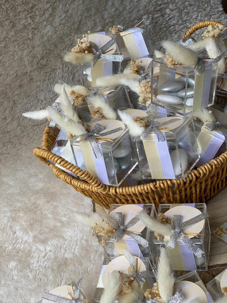 Découvrez nos élégantes boîtes à dragées, parfaites pour vos événements spéciaux comme les mariages et baptêmes. Chaque boîte transparente est finement décorée avec des rubans argentés et des éléments floraux raffinés, ajoutant une touche de sophistication à votre célébration. Prêtes à offrir, elles contiennent des dragées aux couleurs douces. Idéales pour laisser une impression durable auprès de vos invités.