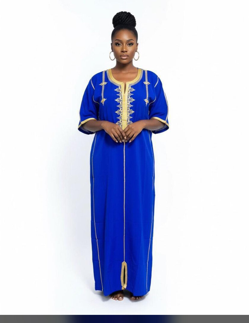 Découvrez ce magnifique caftan bleu pour femme, orné de détails dorés. Conçu pour une élégance quotidienne ou pour des occasions spéciales. Tissu confortable et coupe fluide.