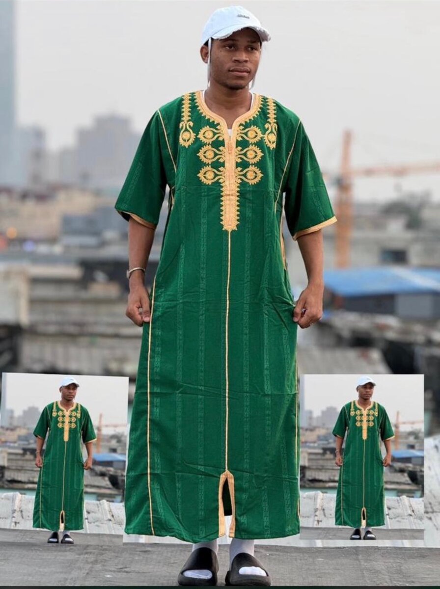 Caftan africain pour homme, disponible en vert et orange. Conçu pour un confort optimal, il est idéal pour les occasions spéciales ou décontractées. Fabriqué avec des matériaux de qualité, il offre une touche d'élégance africaine.
