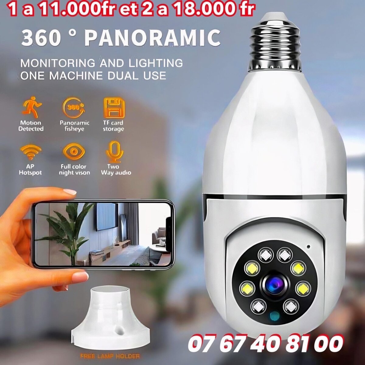 Caméra qui ce connecte au téléphone avec une installation facile cest comme mettre une ampoule, rotation 360 degré, qui sall dans le noir, qui prend une carte Menoir allants jusquà 128 giga , infrarouge, image couleur. Suivez à distance tout ce qui ce passe et ce dit chez vous.