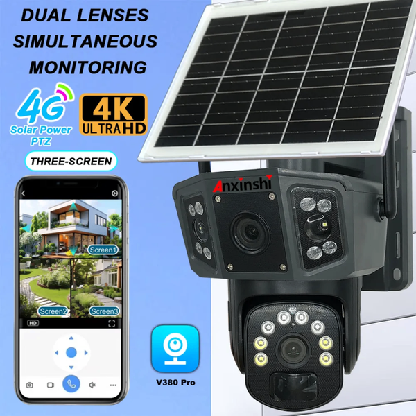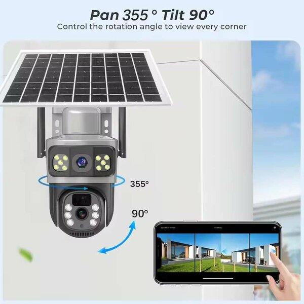 Caméra de sécurité solaire 12MP 3 lentilles offrant une résolution Ultra HD. Idéale pour un usage extérieur avec vision nocturne et détection de mouvement. Installation facile grâce à son panneau solaire intégré. Parfaite pour sécuriser votre maison ou entreprise.