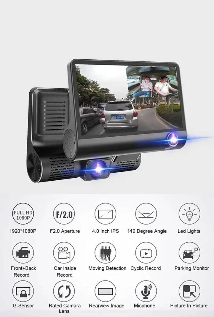 Caméra de tableau de bord avec enregistrement avant et arrière, écran IPS 4 pouces, angle de 140 degrés, détection de mouvement et surveillance de stationnement. Enregistre en Full HD 1080P avec une ouverture F2.0. Équipée de LEDs infrarouges pour une visibilité nocturne.