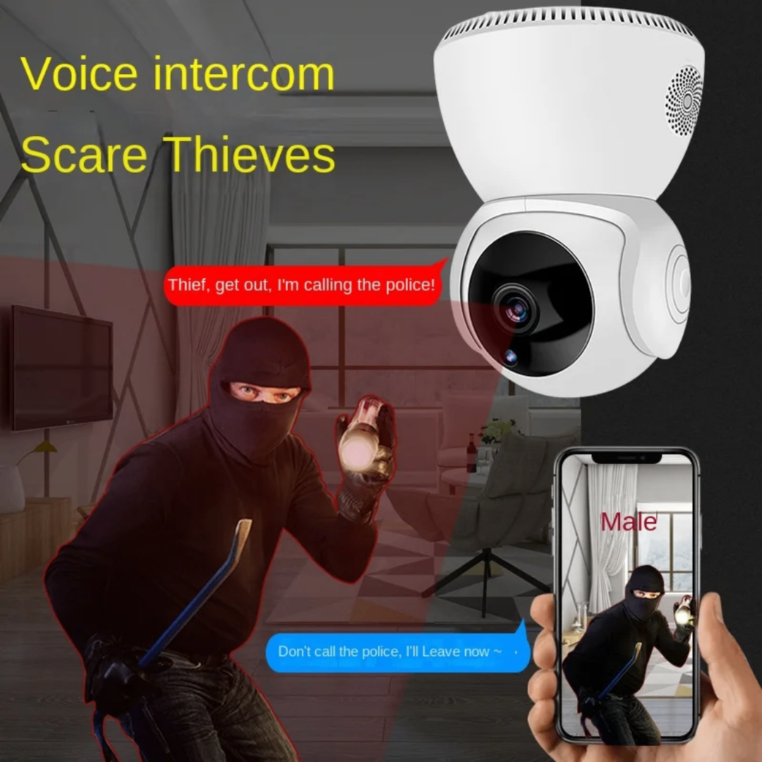 Caméra WiFi intérieure avec double objectif 4MP, zoom et détection de mouvement. Intercom vocal pour dissuader les intrus. Compatible avec smartphone, idéale pour surveiller votre maison ou bureau.