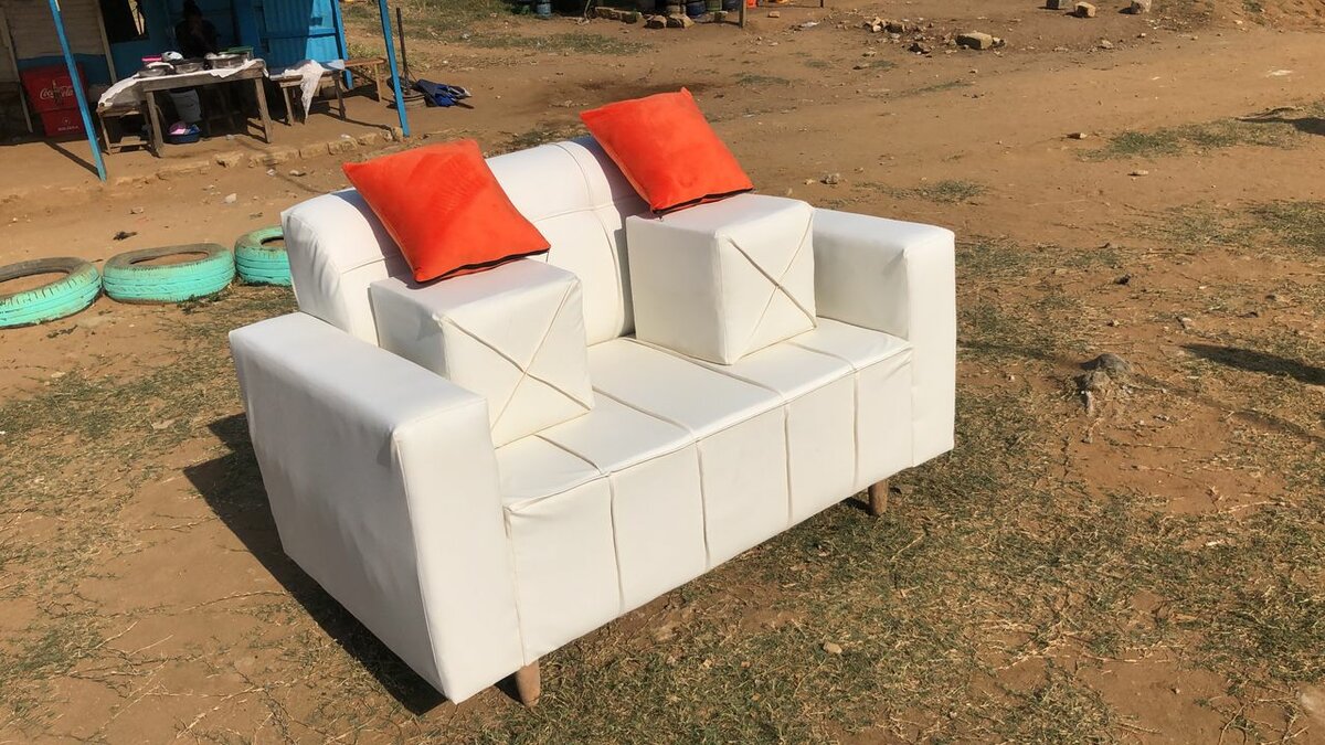 Canapé 3 places en cuir blanc avec deux coussins orange. Confortable et élégant, idéal pour le salon ou la salle de séjour. Fabriqué en cuir de haute qualité.