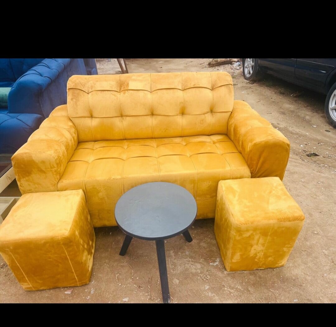 Ensemble salon moderne comprenant un canapé 3 places en velours jaune et 2 poufs. Confortable et élégant, idéal pour votre séjour.