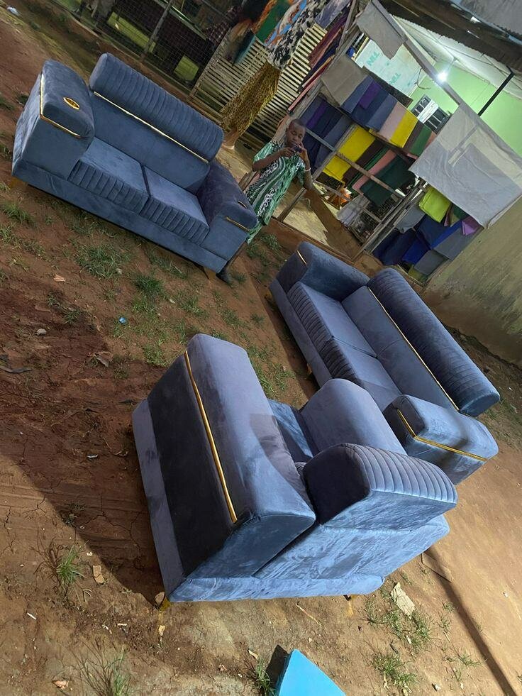 Canapé 3 places en tissu gris avec coutures jaunes. Confortable et moderne, idéal pour le salon ou le séjour. Facile à entretenir.