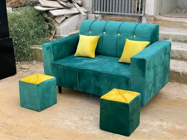 Élégant canapé 3 places en velours vert avec 2 ottomans assortis. Confort et style pour votre salon ou salle de séjour. Facile à intégrer dans votre décoration intérieure.