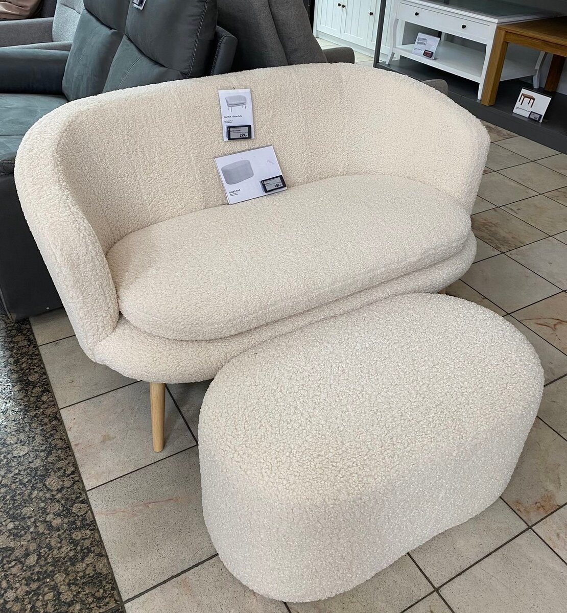 Transformez votre salon avec ce canapé élégant et confortable, accompagné d'un repose-pieds assorti. Idéal pour les moments de détente entre amis ou en famille. Tissu bouclé doux et allure moderne.