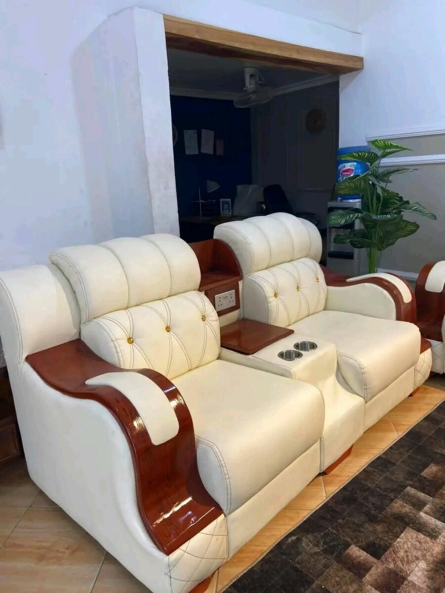 Découvrez ce canapé en cuir blanc avec des accents en bois. Il est équipé de porte-gobelets et d'accoudoirs confortables, parfait pour le salon.