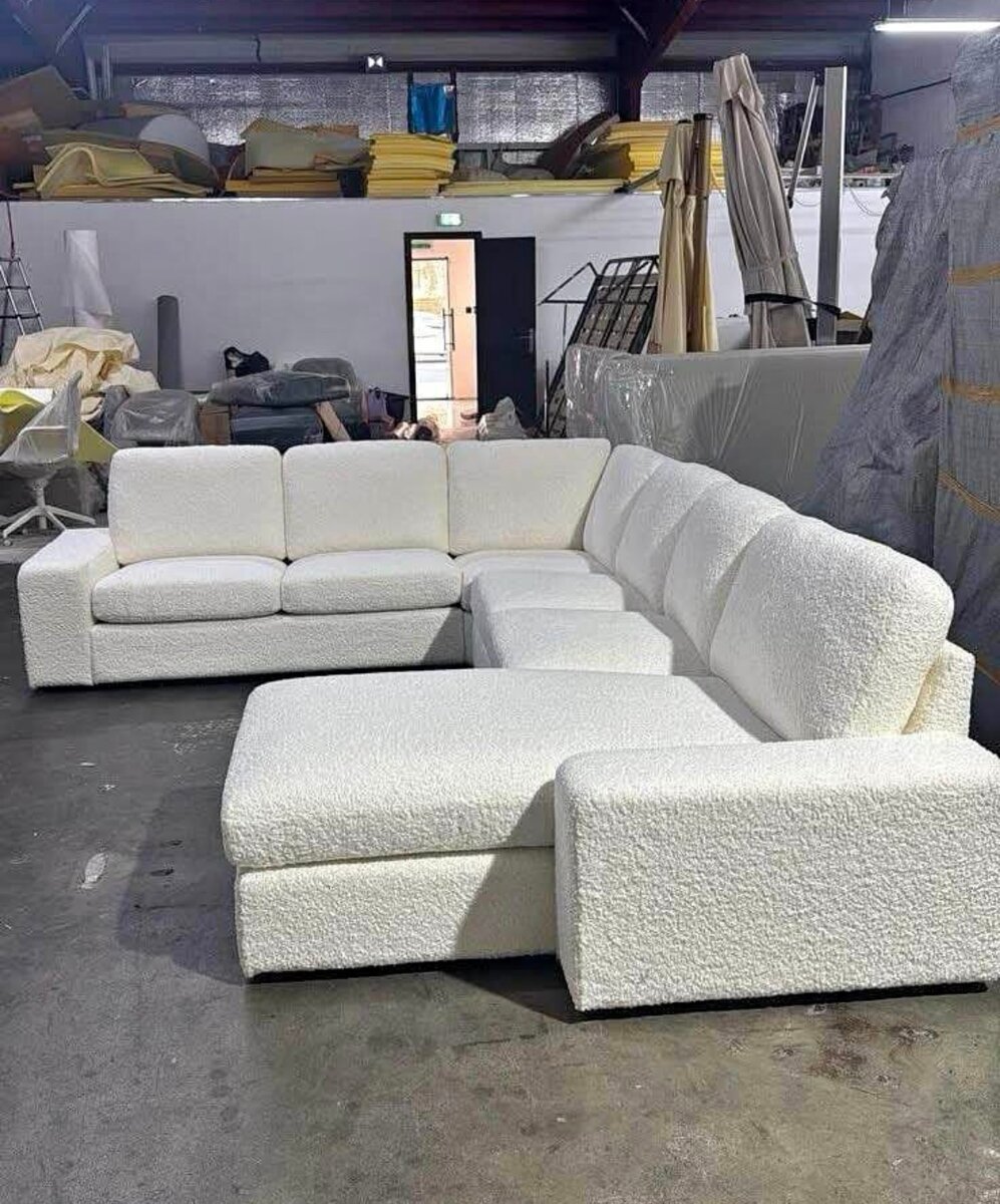Canapé d'angle en tissu blanc pour un salon moderne. Confortable et élégant, idéal pour des soirées entre amis ou en famille.