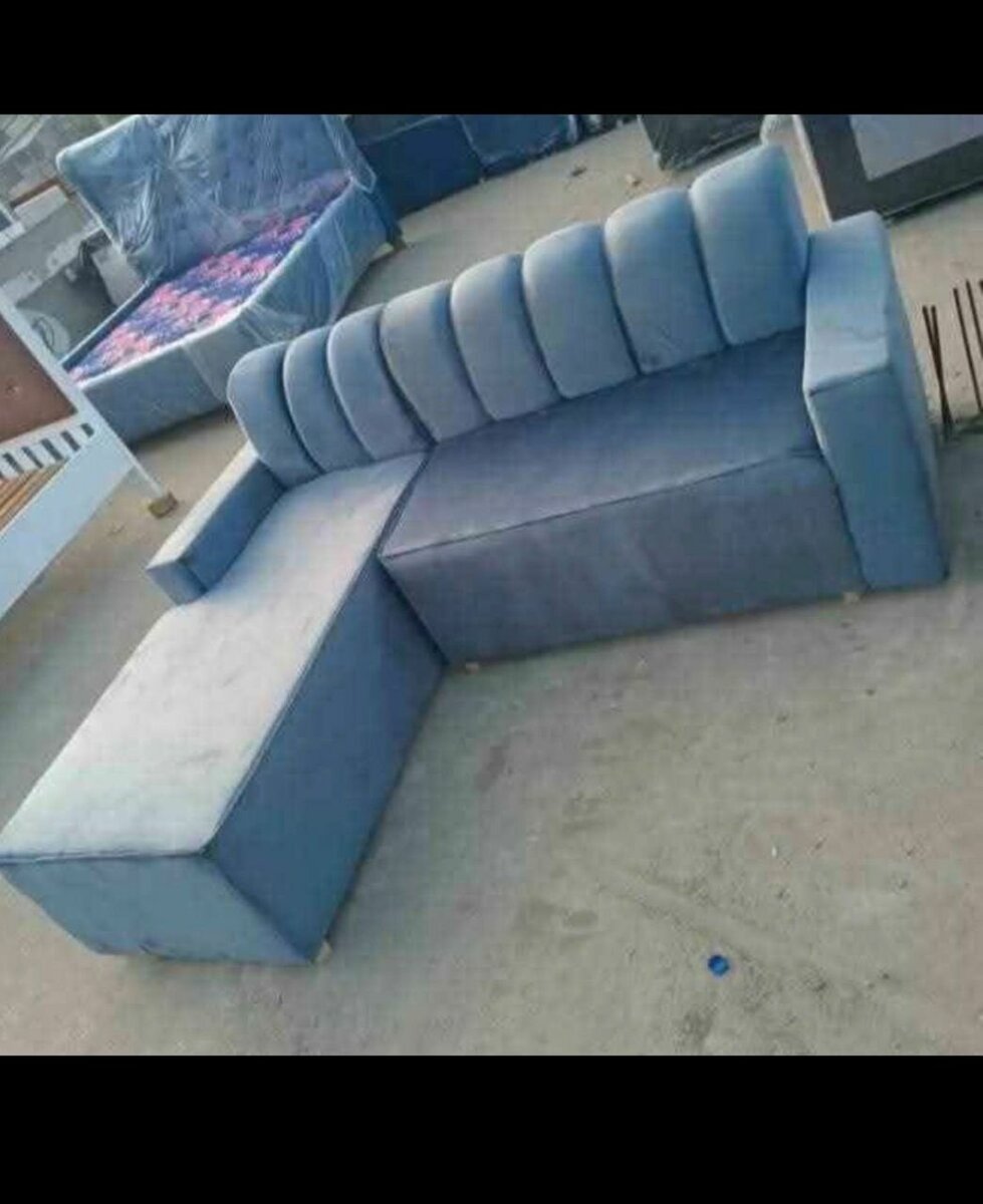 Canapé d'angle moderne en velours bleu pour salon. Confortable et élégant, parfait pour les petits espaces. Facile à nettoyer et durable.