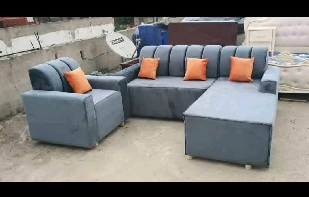 Élégant canapé d'angle gris avec méridienne et fauteuil assorti. Confortable et moderne, idéal pour votre salon. Tissu résistant et facile à entretenir.