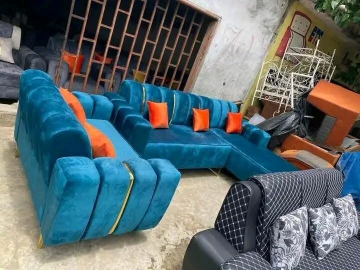 Canapé d'angle en velours bleu avec coussins orange. Conçu pour le confort, idéal pour les salons modernes. Tissu en velours doux et résistant.