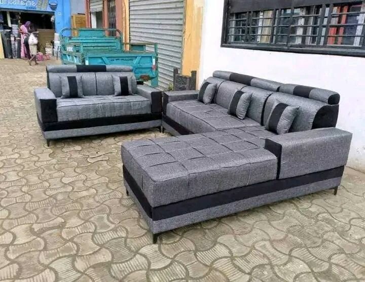 Ensemble canapé d'angle et ottomane gris et noir pour un salon moderne. Confortable et élégant, idéal pour les espaces de vie contemporains.