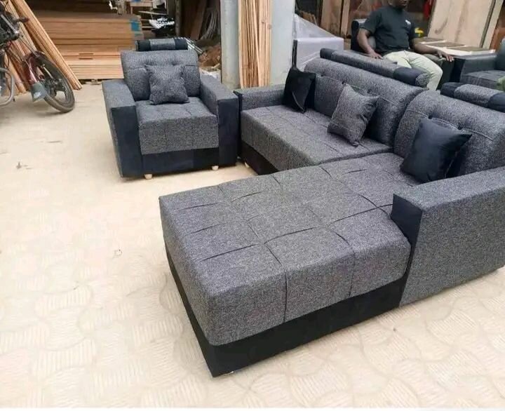 Ensemble de canapé d'angle gris moderne avec ottomane et fauteuils. Conçu pour le confort et l'élégance, idéal pour les salons spacieux.