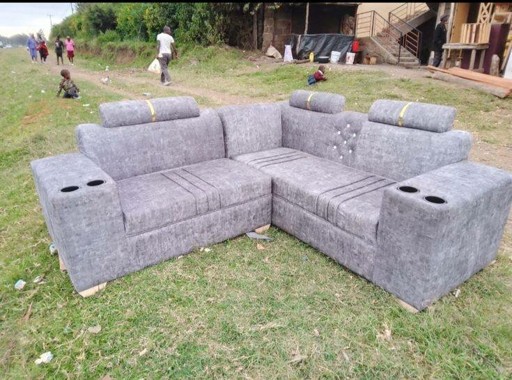 Canapé d'angle gris moderne avec espaces de rangement et appuie-tête. Conçu pour le confort et la praticité, idéal pour les salons modernes.
