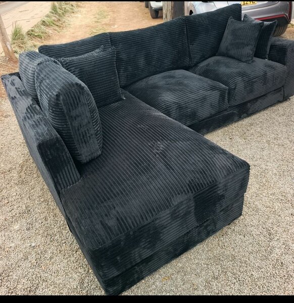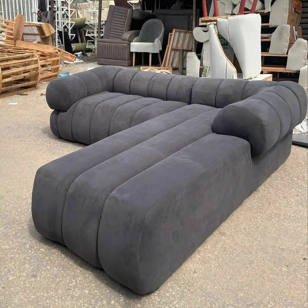 Canapé d'angle moderne en velours gris foncé. Conçu pour le confort, il est idéal pour les salons contemporains. Sa forme arrondie et son revêtement en velours apportent une touche de luxe. Conviendrait parfaitement pour un espace de vie moderne.
