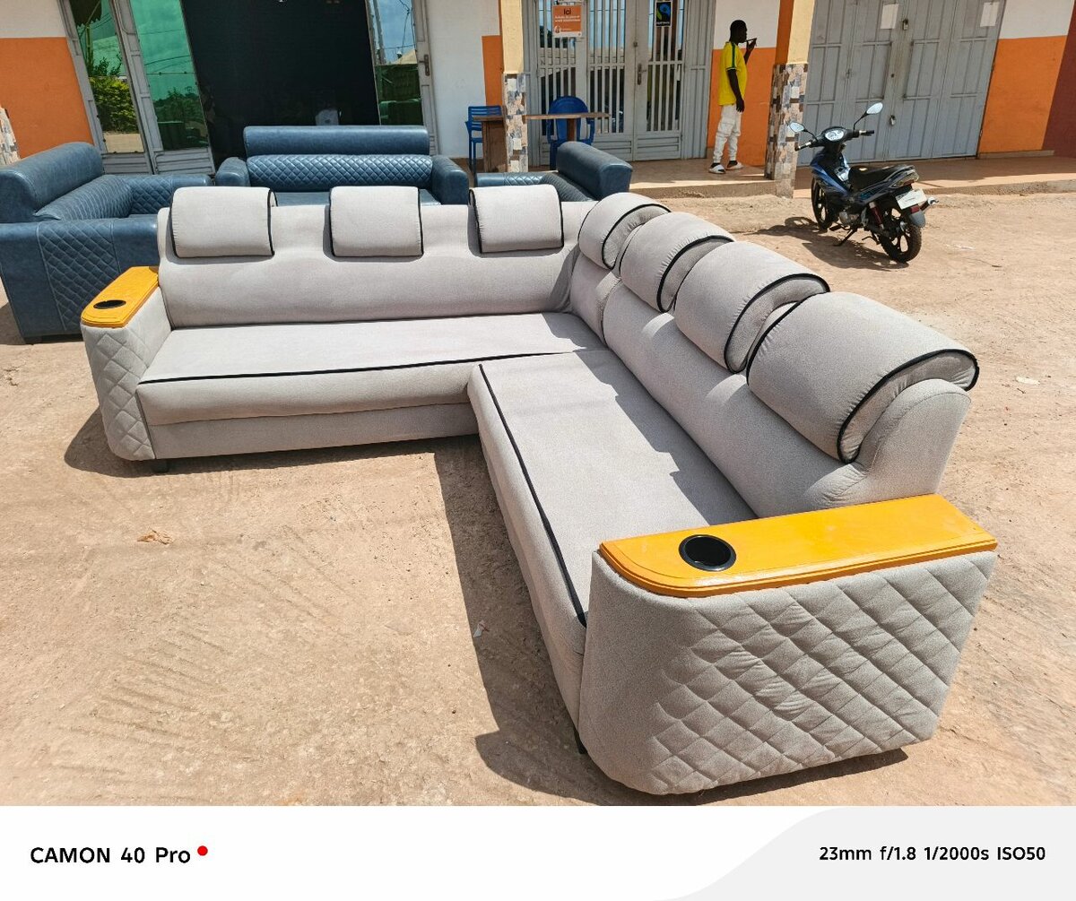 Transformez votre salon avec ce canapé d'angle élégant et confortable, doté de repose-têtes et d'accoudoirs en bois avec porte-gobelets. Parfait pour recevoir des invités ou se détendre en famille.