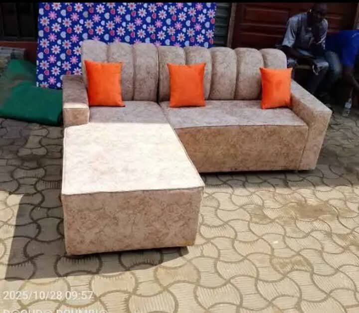 Transformez votre salon avec ce canapé d'angle élégant, doté de coussins orange vifs pour un look contemporain. Parfait pour les réunions de famille ou un moment de détente.
