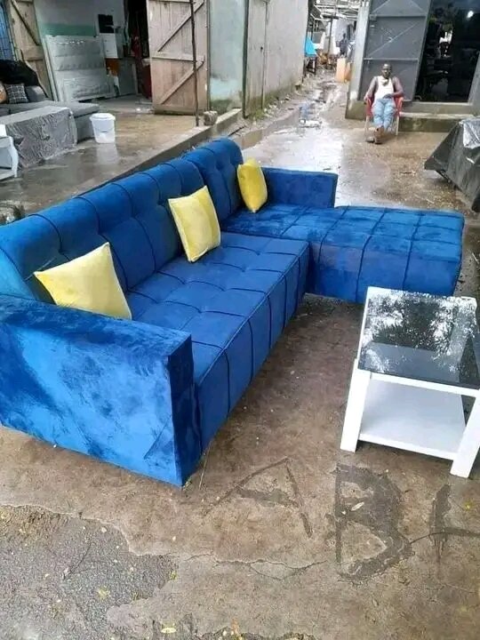 Élégant canapé d'angle en velours bleu, parfait pour ajouter une touche de luxe à votre salon. Conçu avec des coussins confortables. Idéal pour se détendre ou recevoir des invités.