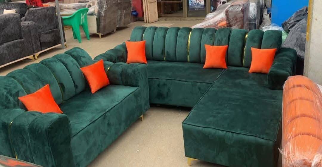 Élégant canapé d'angle en velours vert pour un salon moderne. Confortable et spacieux, idéal pour des soirées entre amis ou en famille.