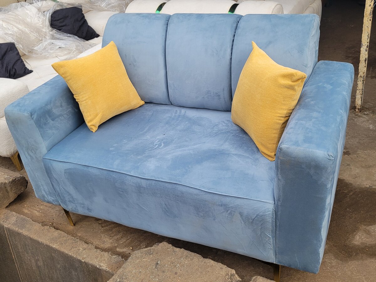 Ajoutez une touche d'élégance à votre salon avec ce canapé deux places en velours bleu. Confortable et stylé, il est accompagné de coussins jaunes pour un contraste moderne. Parfait pour les petits espaces, il offre un confort optimal grâce à son rembourrage moelleux. Idéal pour les moments de détente ou les discussions intimes. Un choix parfait pour embellir votre intérieur avec une touche de style et de couleur. Transformez votre espace avec ce meuble chic et pratique.