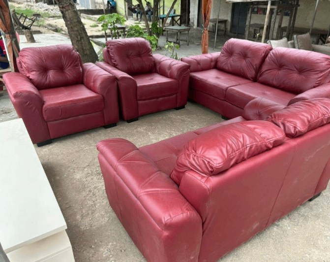 Ensemble de canapé en cuir rouge foncé comprenant un canapé d'angle et deux fauteuils. Conçu pour le confort et l'élégance, cet ensemble est idéal pour les salons modernes. Fabriqué en cuir véritable, il offre une durabilité exceptionnelle.