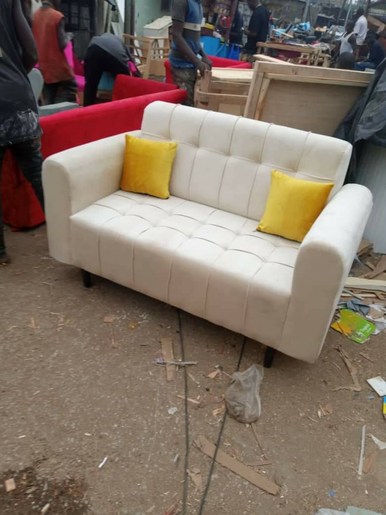 Un canapé confortable en tissu blanc, idéal pour ajouter une touche élégante à votre salon. Doté de deux coussins jaunes lumineux pour un contraste chic. Conçu pour offrir confort et style, parfait pour les petits espaces.