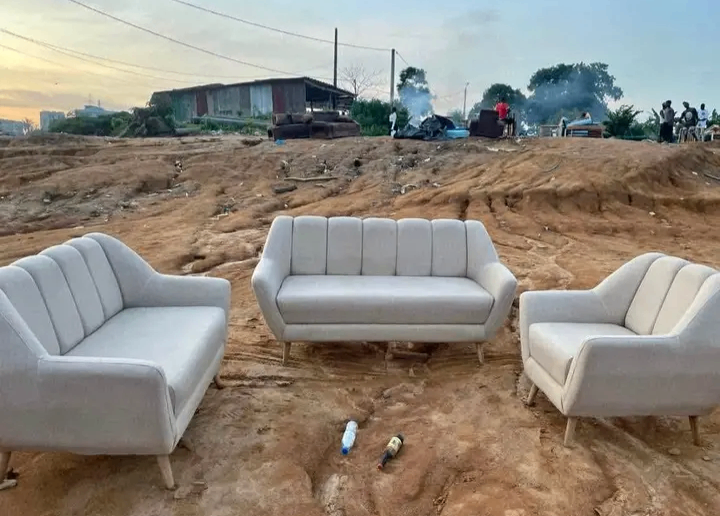 Ensemble de canapé et fauteuils modernes en tissu gris clair, idéal pour le salon ou la salle d'attente. Conception confortable et élégante.