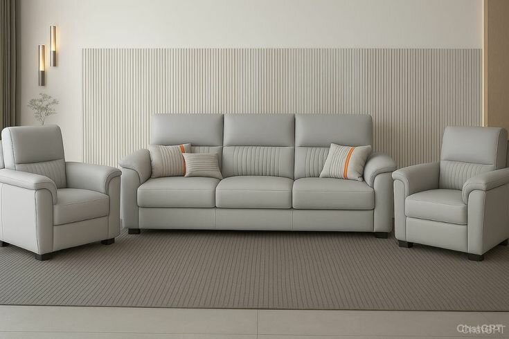 Ensemble de canapé et fauteuils gris clair pour un salon moderne et confortable. Design élégant et matériaux de haute qualité.