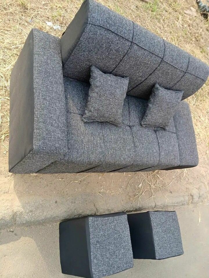 Canapé moderne en tissu gris avec deux poufs. Confortable et élégant, idéal pour le salon ou la salle d'attente. Livré avec deux coussins décoratifs.